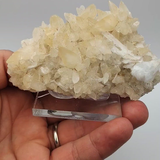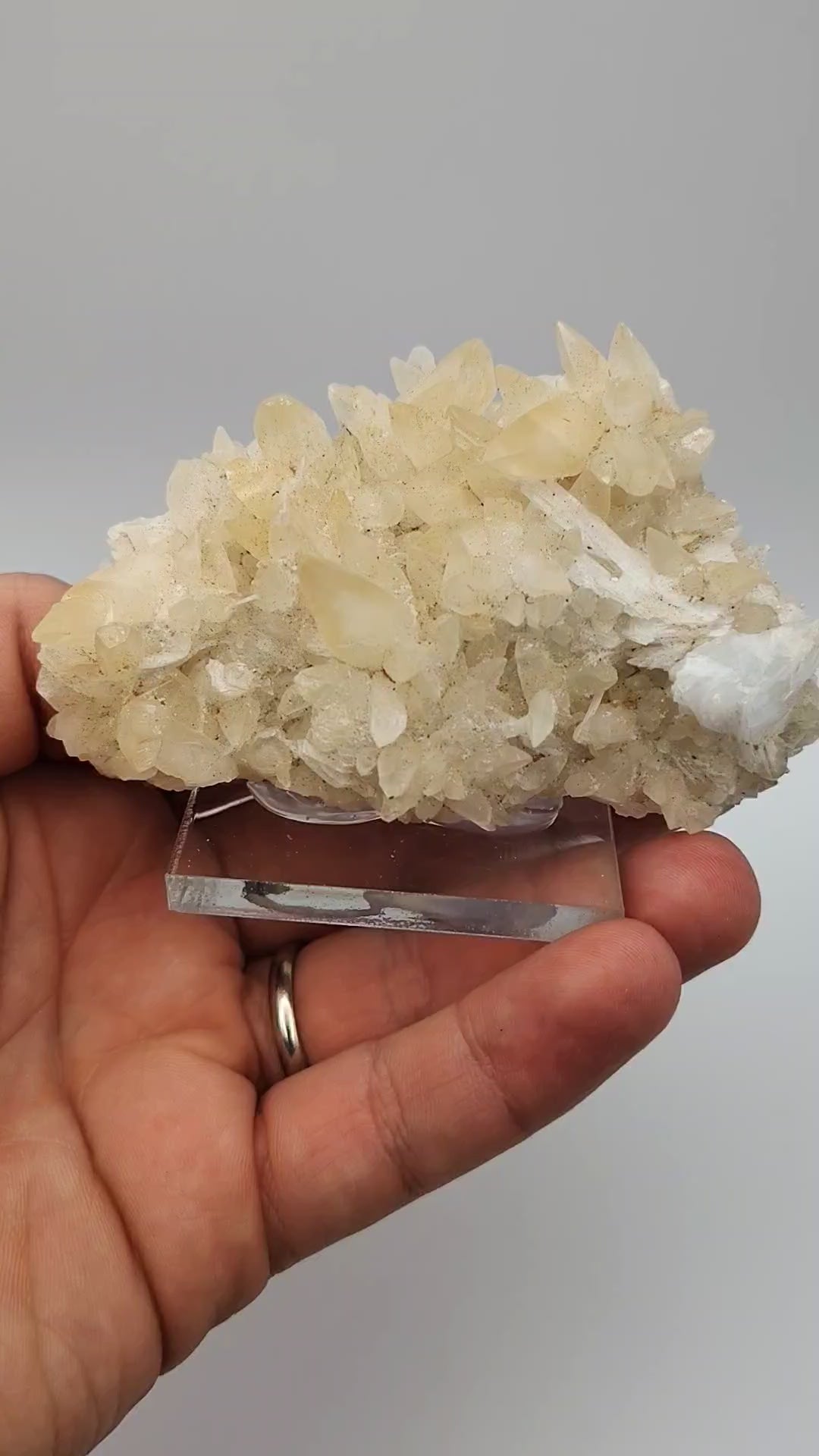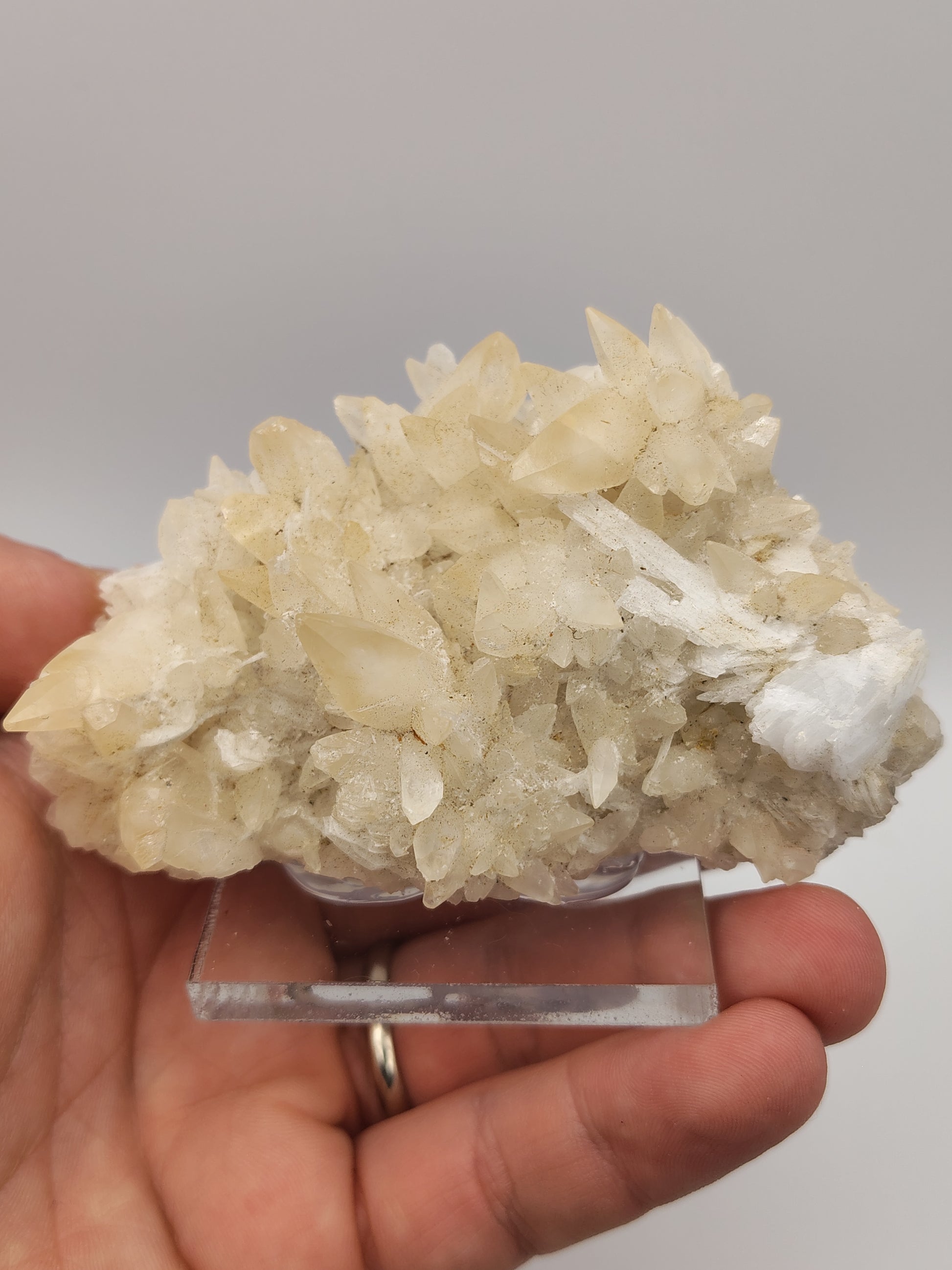 Plate of well formed calcite crystals on minor blue fluorite and Sphalerite. Minor bladed white Celestite crystals on calcite.