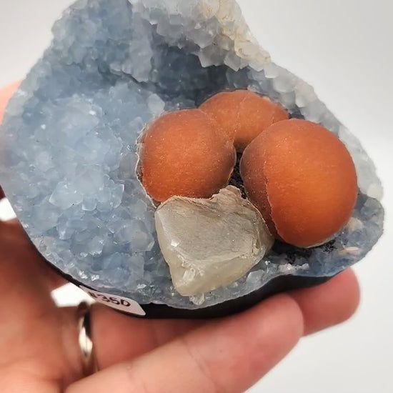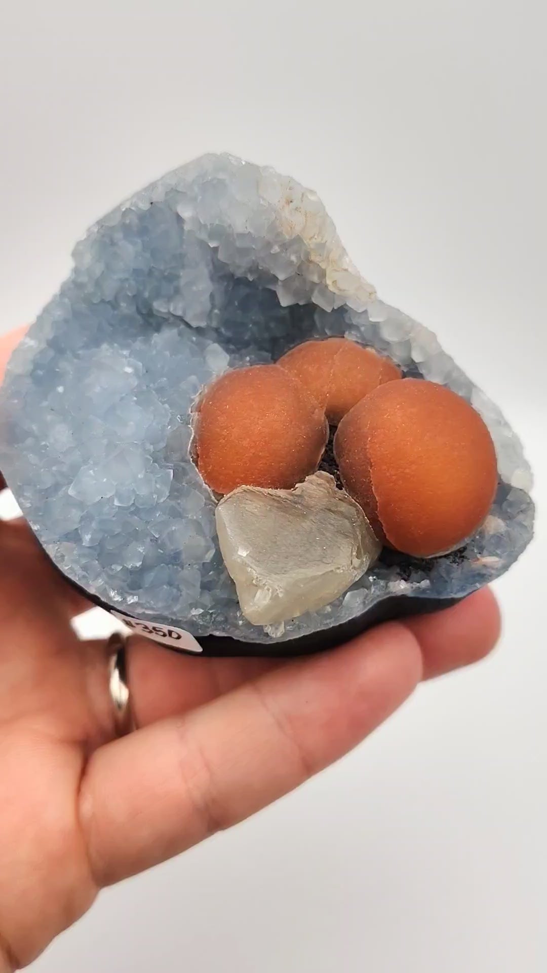 Well formed cluster of red fluorite spheres and slightly distorted rhomb of calcite on bluish quartz matrix.